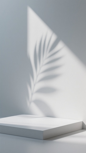 极简主义风格的白色展台场景,纯净的浅灰色背景墙,柔和的自然光从左上角斜射而下,在墙面和台面上投下清晰而富有层次感的植物叶片光影图案,叶片投影呈现出半透明的渐变效果和细腻的轮廓边缘,光影交错形成自然的韵律感,整体画面营造出宁静、优雅、简洁的氛围,光线明亮柔和,阴影过渡自然,具有高品质的3D渲染质感,画面下方是光滑平整的白色展台平面,展台边缘与背景墙自然衔接,整个构图简约大气,留白充足,视觉焦点集中在光影与展台的结合部。