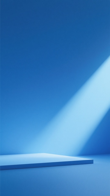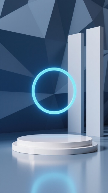 极简主义展台设计,以深蓝色为主色调,搭配浅灰色几何立体墙面背景,中央为圆形白色展台,台面光滑有反光质感,展台后方悬浮着一个半透明的蓝色发光圆环,左侧有两根垂直的浅灰色立体柱体,整体画面简洁干净,光影柔和,营造出科技感与高级感,无任何文字和多余装饰元素。