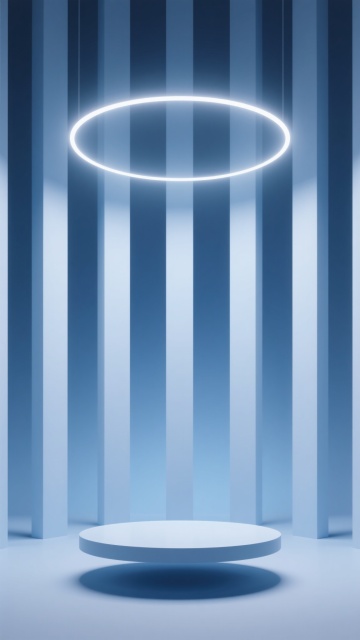 极简风格展台,干净简洁的设计,圆形悬浮展台,柔和渐变的蓝色主色调,背景有垂直排列的白色几何柱体,中央上方有发光的半透明圆环光效,柔和的顶部光源,清晰的阴影,光滑的材质表面,简约的现代感,无多余装饰元素