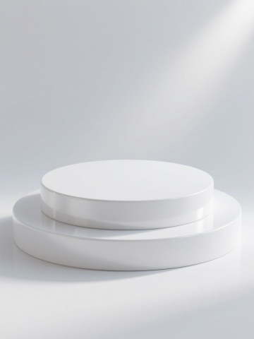 一个具有高级3D渲染质感的圆形展台,展台主体为纯净的白色,表面光滑细腻,带有轻微的反光效果,展现出简约而现代的设计感。展台由上下两层圆形平台组成,下层略宽于上层,边缘线条圆润流畅。整体置于纯白色的纯色背景中,光源从上方偏右位置柔和照射,在展台表面形成自然的高光区域和轻微的阴影过渡,增强了展台的立体感和空间层次。