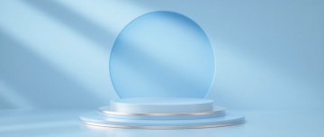 极简主义风格3D渲染,柔和的浅蓝色渐变背景,顶部有流畅曲线构成的白色半弧形装饰,下方是圆形双层台阶式白色展台,展台表面光滑反光,光线从左上方柔和照射,形成轻微的阴影和高光过渡,整体画面干净通透,留白充足,营造出宁静、空旷、简约的空间氛围,无任何文字和装饰元素。
