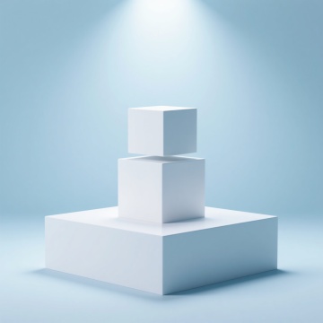 一张写实风格的白色几何展示台图片,画面中由三个不同高度的白色几何体块构成展示平台,呈现出简洁的立体结构。采用柔和的自然光照明,光线从左上方照射,在几何体块表面形成自然的明暗过渡和清晰的投影,展现出光滑细腻的白色哑光材质质感。整体构图简洁大方,以纯白色为基调,背景为纯白色,突出展示台的立体形态和空间感,营造出简约、现代、专业的氛围,适合作为产品展示的舞台背景。