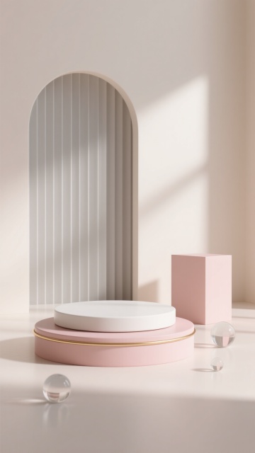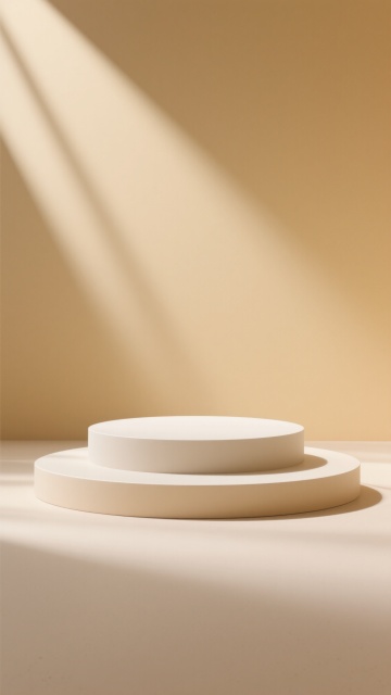 极简禅意中国风展台设计,展台居中放置,由上下两层浅色圆润几何平台构成,主色调为米白色与暖米色渐变,柔和自然光从左上角斜射形成清晰光影线条与投影,背景为纯色米黄色,整体营造宁静、简约、雅致的东方禅意氛围,具有极高的视觉层级与信息传达效率,设计感十足。