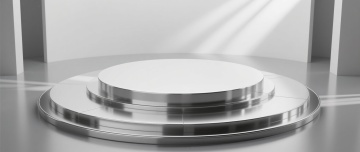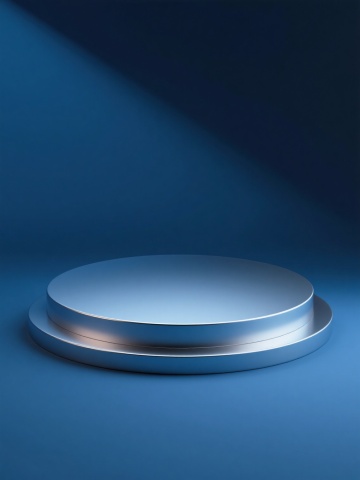 3D渲染的圆形展台,平滑的金属质感,高光与阴影过渡自然,深蓝色纯色背景,展台下方有一圈较窄的基座,整体呈现简约现代的设计风格,光线从斜上方照射,形成柔和的明暗对比,无LOGO、文字及二维码等元素。