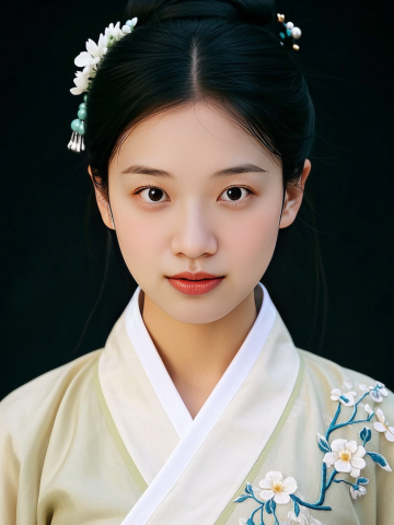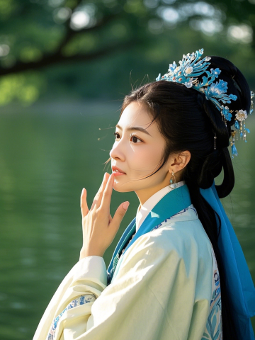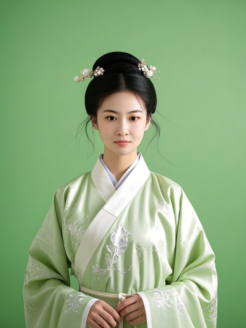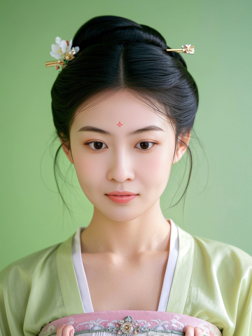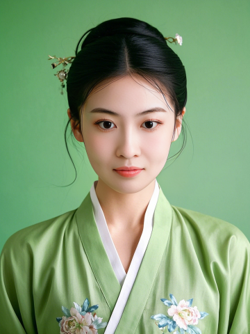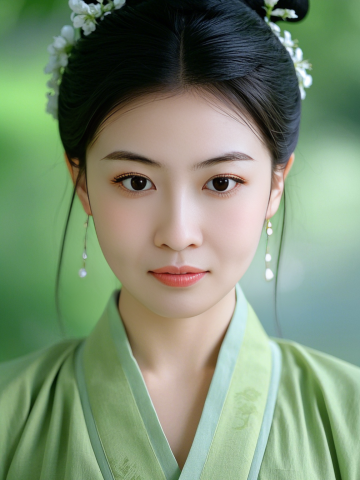一名身穿绿色系汉服的女生,中式发饰,皮肤纹理清晰,高清商业摄影,半身照,人物特征保持