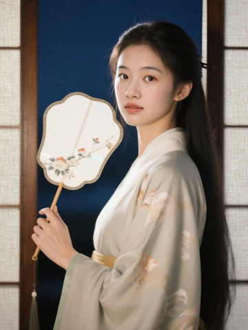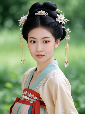 穿着水绿色襦裙的唐朝仕女,鬓边插珍珠步摇,手中团扇绘牡丹,廊下紫藤花飘落,工笔淡彩滤镜