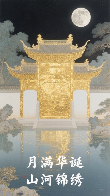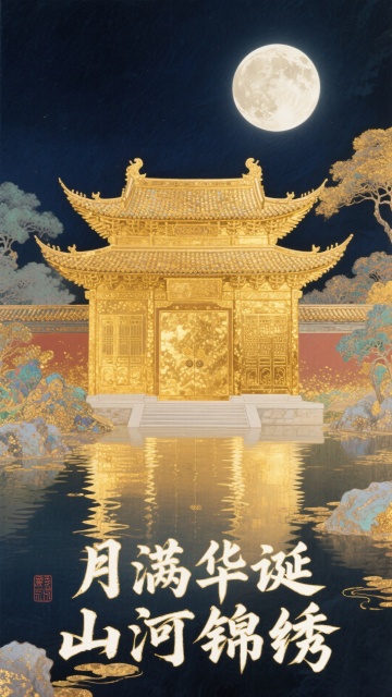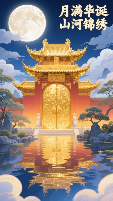 在静谧的中式园林场景中,一轮皎洁的明月高悬夜空,洒下银白的光辉。一座传统中国宫殿大门矗立眼前,整体呈现金色,拥有多层结构与弯曲的飞檐,飞檐上的瓦片纹理清晰,边缘微微上翘,尽显古韵。大门表面覆盖着闪闪发光的纹理,从顶部明亮耀眼的金色到底部柔和温暖的金色自然渐变,宛如被月光轻抚,反射出梦幻般的光芒。大门前有一泓平静的湖水,月光倾洒在湖面,与大门金色光辉相互交融,大门在湖中形成清晰且逼真的倒影,随着微风吹过,倒影泛起层层涟漪。画面下方以古朴大气的书法字体写着 “月满华诞 山河锦绣” 字样,整体营造出庄重典雅、喜庆祥和且富有诗意的氛围。