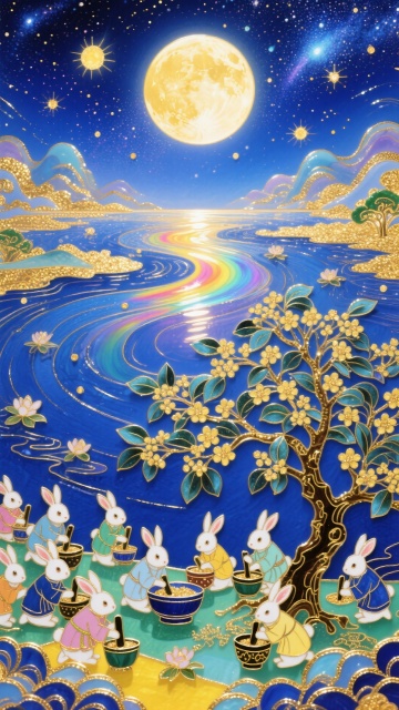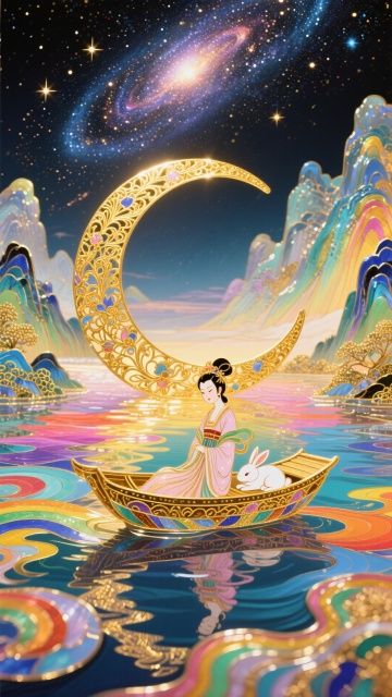 梦幻夜空下,玉兔泛舟于鎏金漩涡之海,月华如练,中式国潮插画风融合液态浮雕质感,营造奢华唯美中秋意境。