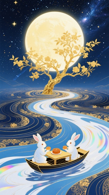梦幻奇幻风格,全景,小船(漂浮在蓝白色河流上,船上有玉兔和两个月饼 )居画底部,星空漩涡从小船向四周扩散成漩涡状星空(深金色交织) ,中央巨大的发光满月,超现实的星空河流世界,梦幻感,色彩以深邃蓝、暖黄为主,搭配金色点缀