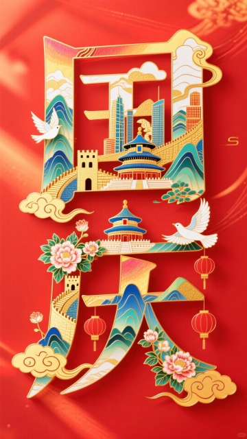 围绕着金色数字,白鸽优雅地展翅飞翔,它们身姿轻盈,翅膀伸展的弧度优美,仿佛带着和平的祝福。还有中国传统建筑的红色剪影,比如宫门,飞檐斗拱、朱红大门的轮廓清晰可见,尽显古朴韵味。
