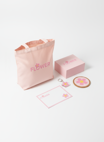 参考这个LOGO,做一套文创品牌视觉设计,品牌名称为“FLOWER",包括帆布包,便签纸砖,杯垫,钥匙扣,明信片等。浅粉视觉主色调,现代、精致、亲切现代风格