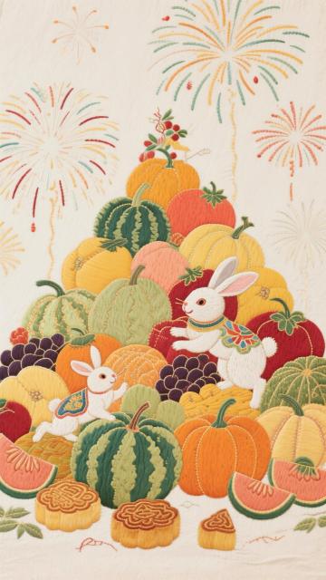 刺绣风工笔画,拟人化玉兔穿梭于瓜果堆中,融合中式元素与卡通感,烟花点缀喜庆氛围,传递中秋佳节的可爱与祥和。