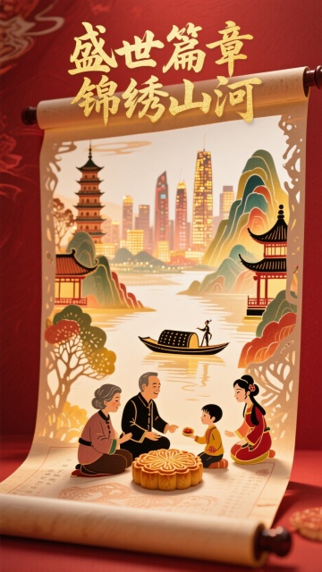 在静谧的中式园林场景中,一轮皎洁的明月高悬夜空,洒下银白的光辉。一座传统中国宫殿大门矗立眼前,整体呈现金色,拥有多层结构与弯曲的飞檐,飞檐上的瓦片纹理清晰,边缘微微上翘,尽显古韵。大门表面覆盖着闪闪发光的纹理,从顶部明亮耀眼的金色到底部柔和温暖的金色自然渐变,宛如被月光轻抚,反射出梦幻般的光芒。大门前有一泓平静的湖水,月光倾洒在湖面,与大门金色光辉相互交融,大门在湖中形成清晰且逼真的倒影,随着微风吹过,倒影泛起层层涟漪。画面下方以古朴大气的书法字体写着 白金色“月满华诞 山河锦绣” 字样,整体营造出庄重典雅、喜庆祥和且富有诗意的氛围。
