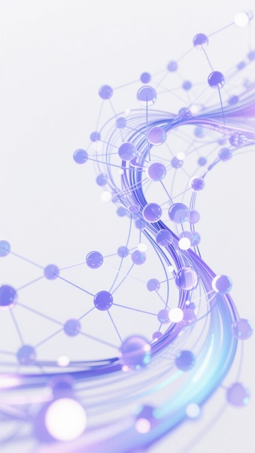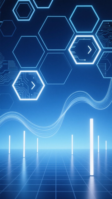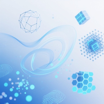 极简科技风格背景,由蓝色渐变线条和发光粒子构成,包含完全不同形态的科技感元素:几何多边形网格结构、立体数据流环、量子纠缠状线条、六边形蜂窝状发光模块、3D旋转立方体阵列、动态脉冲波纹、矩阵光斑投射效果,整体保持轻盈通透的视觉效果,线条流畅且具有未来感,粒子光点均匀分布,色调以浅蓝到深蓝的渐变为主,光影柔和,背景纯净白色,营造出高科技、数字化的抽象氛围。