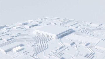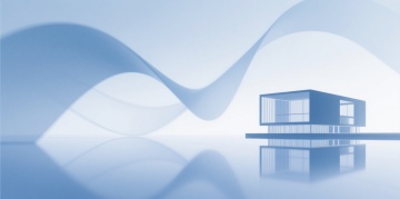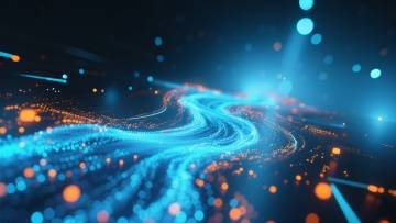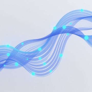 白色背景上,由蓝色半透明渐变线条构成的抽象科技感图案,线条呈现出波浪状的流动形态,点缀着发光的蓝色光点,整体画面简洁、现代,具有未来感和科技感,线条和光点的排列形成了富有节奏感的视觉效果。