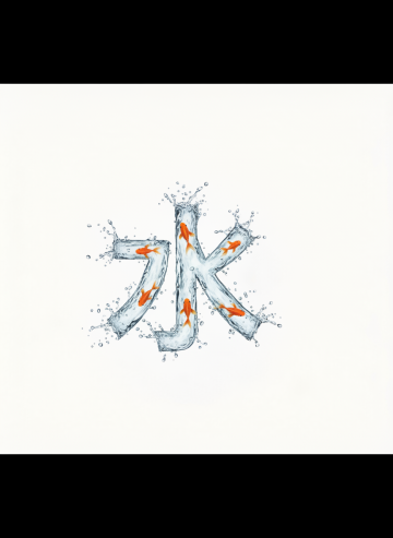 清透感3D风设计,大字“水”以液态形式呈现,金鱼游动其间,生动灵动。