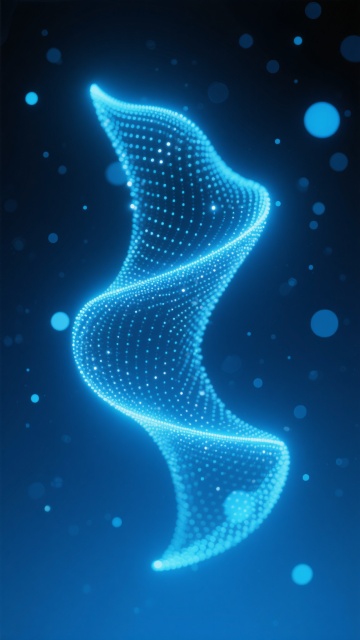 深蓝色渐变背景,深邃神秘的科技感氛围,由发光粒子构成的流动造型,粒子排列紧密且具有规律性,整体呈现出动态的视觉效果,边缘有明亮的蓝色光带勾勒,周围散布着大小不一的光斑和光点,带有柔和的光晕效果,营造出未来感和科技感,光影层次丰富,高光与阴影过渡自然,粒子造型变换为不同于波浪的其他动态几何形态,保持蓝色调的统一性和科技感的氛围。