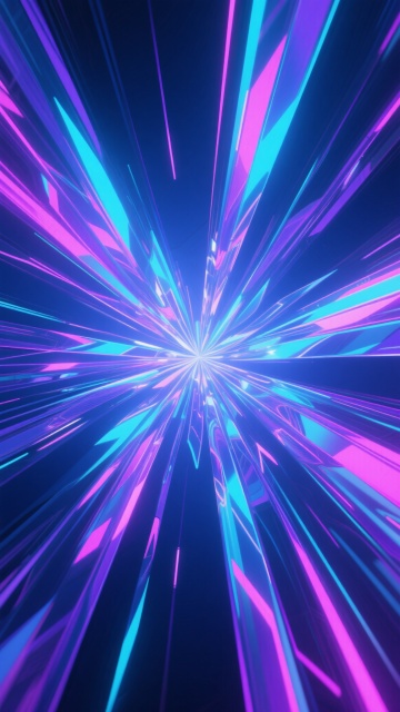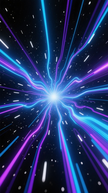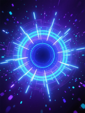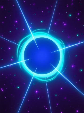 深邃暗紫色背景,中央是一个明亮的蓝色发光圆环,圆环内部为深邃的靛蓝色,圆环边缘有流动的青绿色光晕,从圆环中心向外辐射出多道锐利的蓝白色光线,光线周围散布着细小的紫色和青色星点粒子,整体呈现出神秘而科技感十足的霓虹发光特效,光线具有强烈的方向性和穿透力,光晕边缘有柔和的渐变过渡,粒子分布疏密有致,营造出深邃宇宙中能量核心的视觉效果。