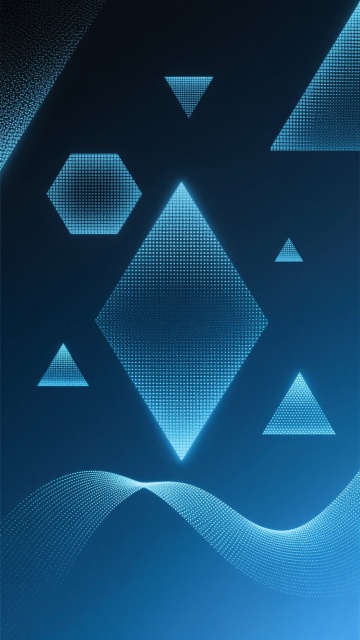 深蓝色渐变背景,融合大小不一的三角形、六边形和菱形几何图形,以柔和的光影效果呈现,搭配由细小点阵构成的波浪线条,整体营造出科技感与现代简约风格的视觉氛围。