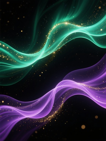 深邃黑色背景上,两条由流动飘逸的发光线条构成的主视觉元素呈上下分布。上方线条以明亮的翡翠绿为主体色调,点缀着闪烁的金色光粒子,如同夜空中飞舞的极光;下方线条则采用优雅的紫罗兰色作为主色,同样交织着细碎的金色光点,整体呈现出梦幻、科技感与艺术美感兼具的视觉效果。线条边缘柔和渐变,光感通透,粒子分布自然,营造出神秘而宁静的宇宙空间氛围。