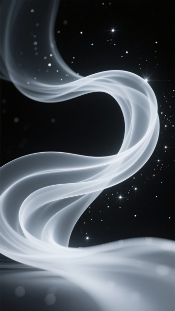 深邃纯黑背景,画面下方以流畅飘逸的白色半透明丝绸般曲线为主视觉元素,线条呈现自然的波浪状交织与流动感,仿佛在黑色空间中轻盈舞动。无数细小的白色光点零星散布于曲线周围及背景中,如同星尘般闪烁,增添梦幻神秘氛围。整体构图采用动态不对称设计,视觉重心偏向下方,光线柔和,曲线边缘有轻微的高光晕染效果,营造出空灵、静谧且富有科技感的抽象背景。