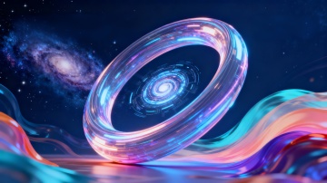 赛博朋克风3D环形装置悬浮于星河之上,霓虹光影交织,液态玻璃质感流动,未来科技与梦幻宇宙碰撞,虚拟现实中的视觉奇观。