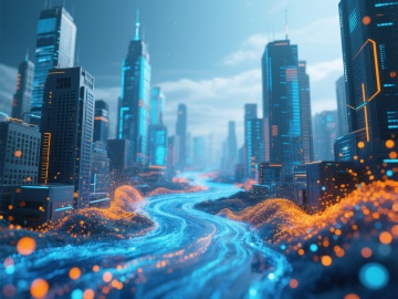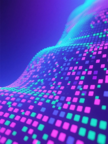 渐变色彩的像素点组成的抽象背景,像素点从底部向上逐渐稀疏,呈现出一种上升的视觉效果,色彩以蓝紫色为主,间杂着粉色和绿色的像素点,整体风格现代、科技感十足,具有流动的韵律感和层次感。