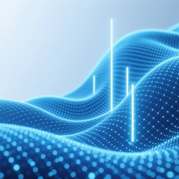 科技感抽象背景,以蓝色为主色调,白色为背景,由大量发光的点和线构成,线条呈现出流畅的波浪形态,部分线条向上延伸形成细长的光柱,整体画面简洁、现代,充满未来感和科技感。