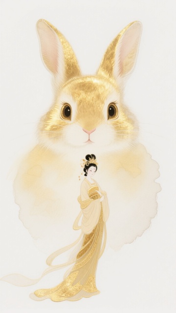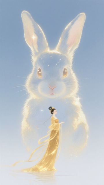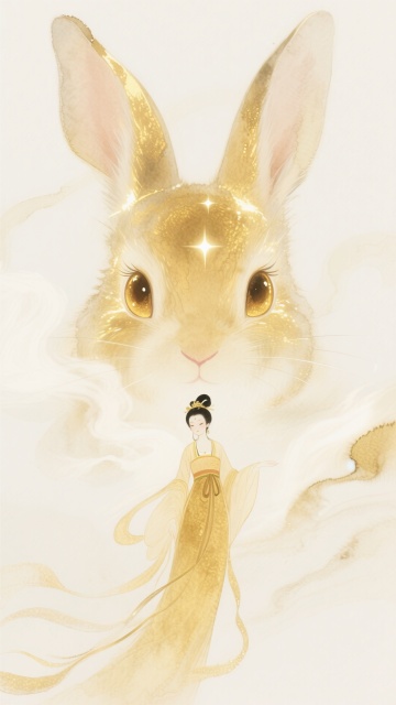 一个巨大的兔子眼睛看着下方的嫦娥(全身),烟雾遮挡露出朦胧的兔头,兔子眼睛有星光效果,浑身金色发光拉丝效果,光细腻如发丝,大面积留白,概念视觉,朦胧,梦幻,对称构图,极致的大小对比,金色调