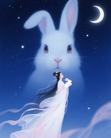 梦幻唯美的中式插画风,嫦娥与玉兔共赏明月,水彩质感搭配刺绣细节,拟人化设计传递中秋佳节的古典浪漫。