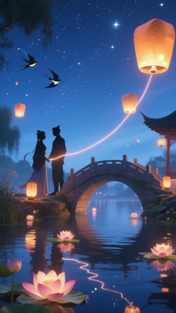 七夕,梦幻浪漫的中式插画,剪影情侣在桥畔,灯笼与莲花映衬,古典超现实主义风格。