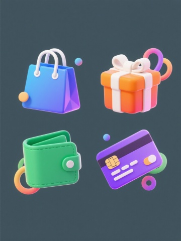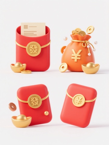 一组4个不同配色、不同样式、不同材质的电商促销元素,采用干净风格,背景为纯白色。每个元素都具有圆润可爱的3D立体造型,明亮的渐变色彩,光滑的塑料质感,以及柔和的高光和阴影效果。第一个元素是红色红包,带有金色圆形封口和飘落的金色硬币;第二个元素是橙色礼盒,系着黄色蝴蝶结;第三个元素是黄色优惠券,印有“券”字和人民币符号;第四个元素是绿色购物袋,带有白色提手和星星图案。所有元素都具有清晰的轮廓,简洁的线条,适合作为电商促销素材使用。