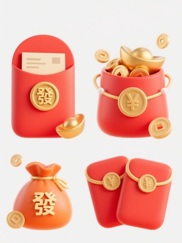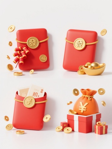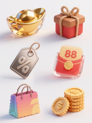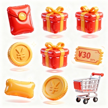 一套6张的系列素材集合,每张素材均为规整排布的单一元素图案,简约现代风格,纯色背景。第一张:金色礼盒微微打开,红色红包和金币从中溢出,金色丝带飘逸环绕;第二张:红色红包堆叠,顶部露出金色礼盒一角,金币散落在红包周围;第三张:金色礼物盒居中,盒盖打开,红包和金币从盒内飞出,几条金色优惠券呈弧形飘落;第四张:红色红包和金色礼物盒并排放置,金币在两者之间滚动,一条优惠券连接两者;第五张:金色礼物盒倾斜,红包和金币从盒口倾泻而下,散落的优惠券点缀其间;第六张:红色红包打开,露出里面的金币,旁边金色礼物盒的丝带系成蝴蝶结,优惠券以红包和礼物盒为中心呈放射状分布。所有元素均采用光滑圆润的造型,色彩以金色和红色为主,带有细腻的高光和轻微的阴影,整体画面干净整洁,充满促销的喜庆氛围。