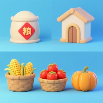 4个中秋素材组合,可爱电商促销感。素材包括:第一个粮仓(贴着带有 “粮” 字的红色菱形福字);第二个一筐玉米;第三个一筐柿子;第四个南瓜。画面整体呈现鲜艳效果,淡蓝色背景。上下两行,排列整齐