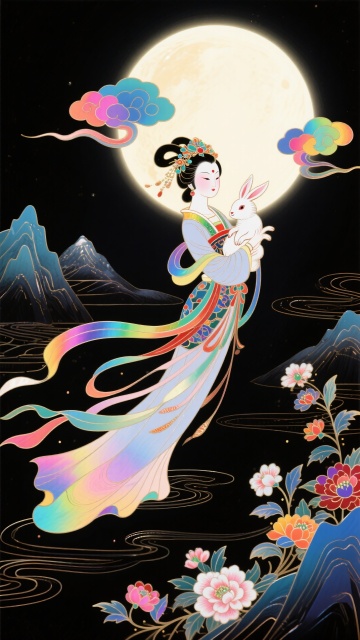 珐琅工艺风格,国潮风中秋节海报,蓝色夜空背景,天空绽放五彩礼花,圆月高悬散发柔和光晕,金色桂花枝从左侧延伸,桂花纷纷扬扬飘落,嫦娥身着飘逸汉服怀抱玉兔飞奔向月,图片底部两只可爱兔子抱着圆形月饼,画面右侧竖着排版“中秋佳节”四个大字,整体色彩浓郁华丽,细节精致,具有传统掐丝珐琅的金属质感和宝石光泽