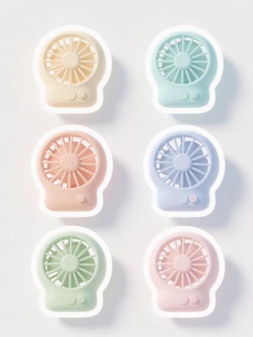 6个不同配色、不同样式、不同材质的卡通风格电风扇,采用简洁圆润的造型设计,低饱和度马卡龙色调,柔和均匀的平面光影效果,边缘有轻微的白色描边,表面带有细腻的颗粒纹理质感,整齐排列在纯白色背景上,每个风扇保持统一的卡通插画风格和视觉比例,整体构图平衡对称,呈现出清新可爱的视觉效果。