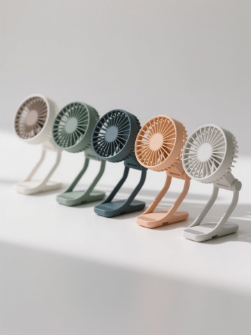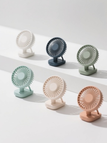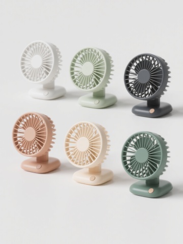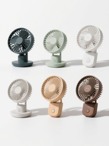六个不同配色、不同样式、不同材质的桌面小风扇,采用简洁现代的设计风格,白色纯净背景,风扇排列整齐形成有序的视觉节奏,每个风扇保持原图中圆形扇叶、简约支架和稳固底座的基本结构特征,光影处理柔和自然,高光与阴影过渡细腻,展现出产品清晰的轮廓和材质质感,整体画面干净利落,突出风扇主体的设计细节与色彩差异,具有产品展示图的清晰明亮特质。