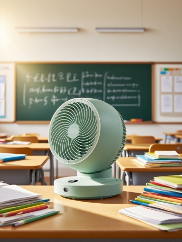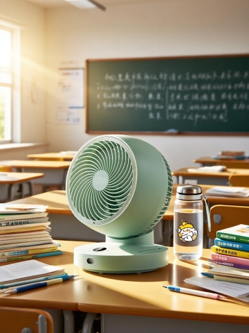 简约主义风格,清新舒适的教室场景,电扇与书本营造宁静学习氛围。