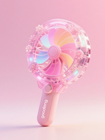 粉色3D风扇,轻拟物风设计,玻璃质感水晶点缀,清新甜美,夏日清凉。