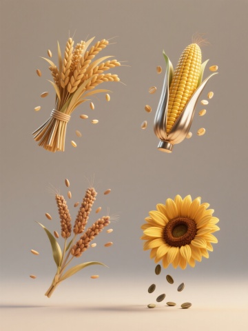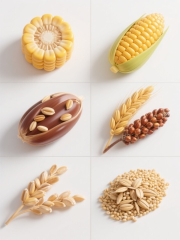 6个不同杂粮谷物(如玉米、小麦、稻谷、高粱、小米、燕麦等)以规整对称方式排布,每个谷物保持高度写实的3D质感,表面细节丰富(如玉米颗粒的饱满纹理、小麦的麦芒质感),色彩鲜艳自然(金黄、浅棕、米白等),搭配绿色叶片等植物部分,整体造型简约现代,置于纯白色纯色背景上,无阴影,无任何文字、logo和水印,画面干净整洁,突出谷物的自然形态和材质感。