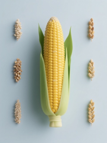 极简现代风格的杂粮谷物系列素材,纯色背景,无文字无logo无水印,每张均以规整对称的几何式排布方式呈现单一品种的杂粮谷物元素,高分辨率3D渲染,超写实质感,清晰的纹理细节,饱满的自然色彩,柔和均匀的光影,主体突出,构图简洁平衡,第一张为带绿色苞叶的完整黄色玉米棒特写。