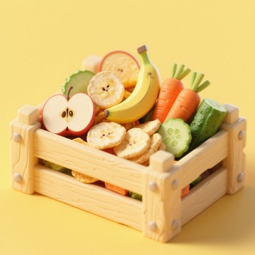 清新3D风轻拟物设计,水果蔬菜组合,简约木箱呈现自然质感。
