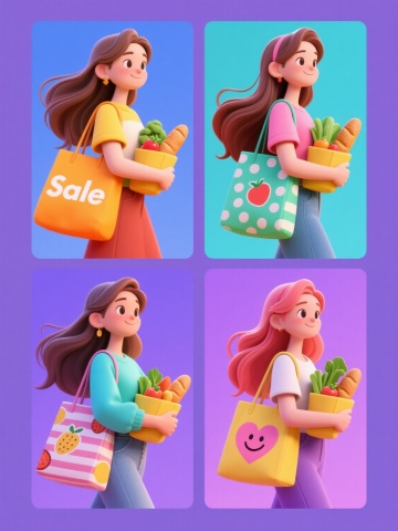 软3D风格插画,四个造型各异的年轻女性角色系列,每个角色均背着不同设计的购物袋(印有“Sale”字样、水果图案、条纹图案、波点图案、爱心图案或笑脸图案),手中抱着装满蔬菜面包的黄色购物袋,长发飘逸,穿着休闲时尚服装,展现对购物的热情与愉悦感。整体色彩采用六个不同色调组合(蓝紫色调、橙黄色调、粉绿色调、红棕色调、青蓝色调、紫粉色调),每个角色独立置于对应色调的纯色背景中,六幅画面呈规整网格排布。画面线条流畅圆润,色块分明,光影柔和,具有清晰的视觉层级和高效的信息传达,符合年轻女性受众审美和购物主题宣传目的,充满时尚设计感与欢快氛围。