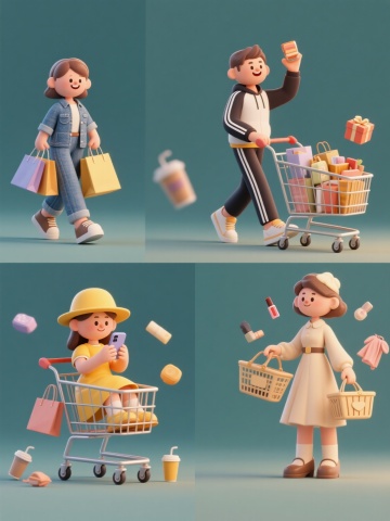 软3D风格插画,纯色背景,四位不同穿搭的购物人物系列素材集合,规整排布。每个角色均呈现圆润可爱的3D建模质感,光影柔和,边缘平滑,色彩鲜明且整体色调变换统一。第一位角色穿着黄色连衣裙与帽子,坐在购物车内手持手机,周围散落购物袋与饮品;第二位角色身着休闲牛仔套装,手提多个购物袋,面带微笑向前迈步;第三位角色穿着时尚运动服,单手推着满载商品的购物车,另一只手举起展示商品;第四位角色打扮成优雅淑女风,提着精致购物篮,身旁漂浮着化妆品与服饰礼盒。所有人物姿态生动活泼,购物元素丰富多样,整体构图平衡对称,画面充满欢快购物氛围,无任何文字、LOGO、电话地址及二维码。