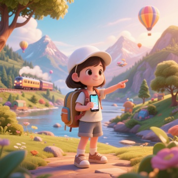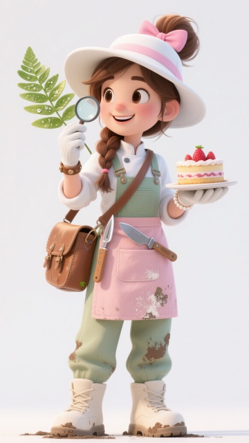 3D卡通风格,一位年轻植物学家,戴着白色宽檐遮阳帽,棕色长发扎成麻花辫垂在胸前,面带温柔笑容,左手托着一株带露珠的绿色蕨类植物,右手拿着放大镜凑近观察叶片纹理,穿着浅绿色工装背带裤搭配白色棉麻衬衫,裤脚沾着泥土,肩上挎着棕色皮质标本采集包,脚穿米色防滑登山靴,腰间挂着多功能工具刀和植物图鉴,手腕戴着棕色皮质手链,整体色彩清新自然,阳光透过树叶在她身上形成斑驳光影,立体感强,细节丰富,人物姿态专注而生动,白色背景突出主体。