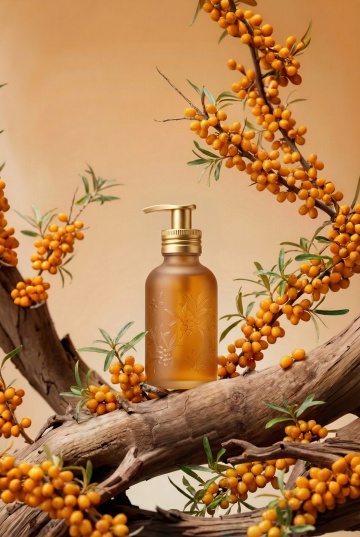暖粉天空为底,搭配棕色产品、橙花与透明底座,色彩柔和雅致,营造出自然清新又治愈的氛围,尽显产品的温润质感