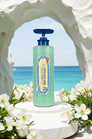 清新感与国潮风融合,瓶身浮雕纹理搭配柔和蓝绿配色,置于白石花丛间,营造出唯美感与文艺氛围,传递清爽舒适的视觉体验。