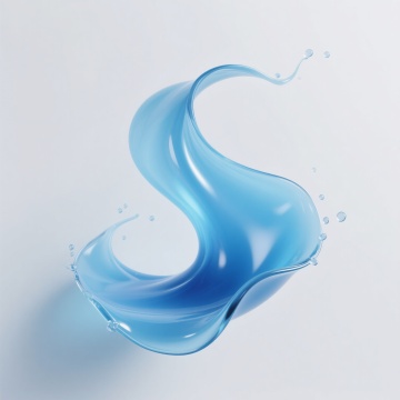 超写实风格的液体造型设计,纯净的白色背景,主体为动态的蓝色液体,呈现出优美流畅的曲线形态,液体表面光滑且富有光泽感,带有清晰的高光和阴影细节,边缘有细腻的飞溅效果和悬浮的小液滴,整体造型灵动飘逸,色彩为清澈的浅蓝色到深蓝色的渐变过渡,光影效果自然柔和,突出液体的透明质感和流动感,画面简洁大气,具有强烈的视觉冲击力和现代设计感。