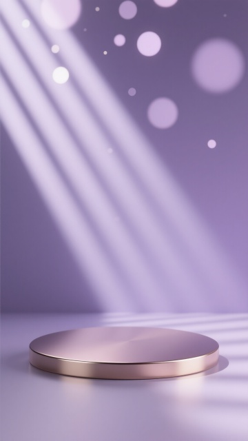 3D渲染风格的产品展示场景,画面中央放置一个圆形的金属展示台,台面光滑且边缘有细微的弧度转折,具有细腻的金属反光质感和柔和的阴影投射。背景为浅紫色渐变,顶部散落着多个模糊的圆形光斑,光线从左上方斜射而下,在台面上形成明暗交错的光影条纹,整体氛围呈现出优雅、梦幻且带有高级感的柔和基调,无任何文字、LOGO、二维码及联系方式。