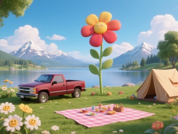 在一片被层叠山峦温柔环抱的静谧山谷中,翠绿的草地上搭着一顶米白色的帐篷,帐篷前摆放着一张木质折叠桌和两把藤编椅,桌上放着一盏马灯和一本书,周围点缀着几簇淡紫色的野花,远处是波光粼粼的湖泊,湖面上有几只白鹭悠闲地掠过水面,天空中飘着几朵粉色的云彩,阳光透过云层洒下柔和的光芒,整个画面呈现出一种宁静而浪漫的油画风格,色彩以柔和的粉紫色调为主,搭配着绿色的草地和蓝色的湖水,营造出温馨舒适的露营氛围。
